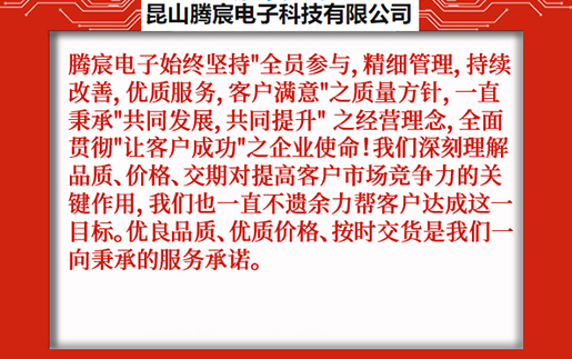 昆山騰宸電子科技有限公司位于中國線路板加工之都昆山千燈,公司專注于電路板研發(fā)設(shè)計、PCB抄板、元器件采購、SMT貼片加工、組裝測試,為客戶提供一站式電子制造服務(wù)。騰宸電子始終堅持"全員參與,精細(xì)管理,持續(xù)改善,優(yōu)質(zhì)服務(wù),客戶滿意"之質(zhì)量方針,一直秉承"共同發(fā)展,共同提升" 之經(jīng)營理念,全面貫徹"讓客戶成功"之企業(yè)使命!我們深刻理解品質(zhì)、價格、交期對提高客戶市場競爭力的關(guān)鍵作用,我們也一直不遺余力幫客戶達(dá)成這一目標(biāo)。優(yōu)良品質(zhì)、優(yōu)質(zhì)價格、按時交貨是我們一向秉承的服務(wù)承諾。 ...